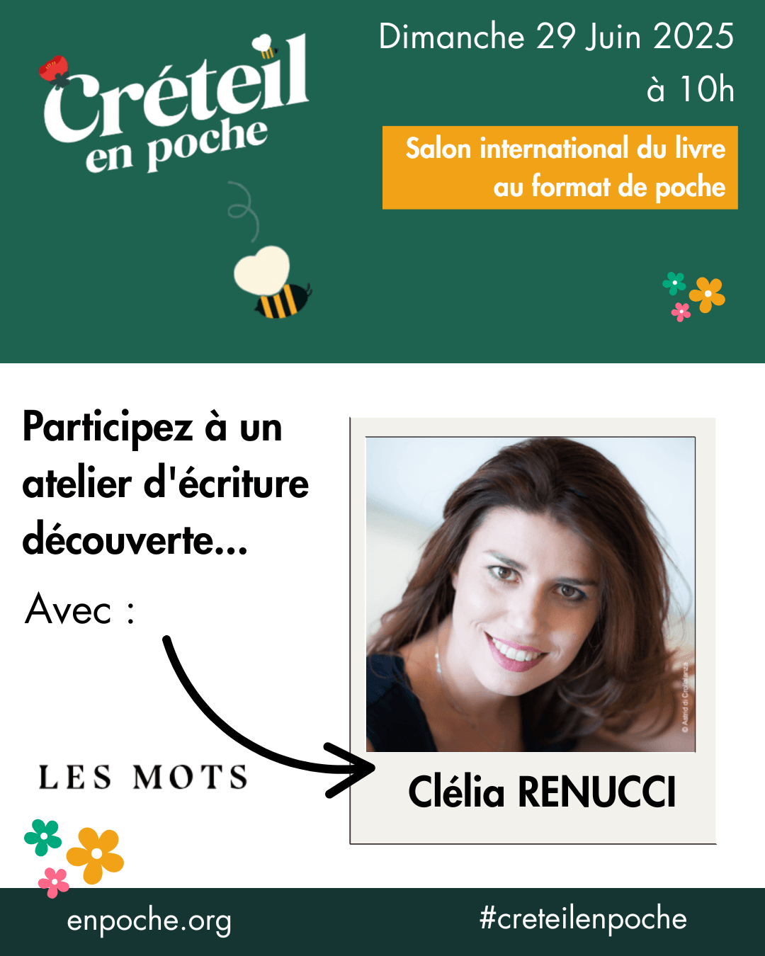 À l’occasion du festival Créteil en Poche, en partenariat avec l’école Les Mots, l’autrice Clélia Renucci vous propose un atelier d’écriture découverte de deux heures. Dimanche 29 juin à 10h.
